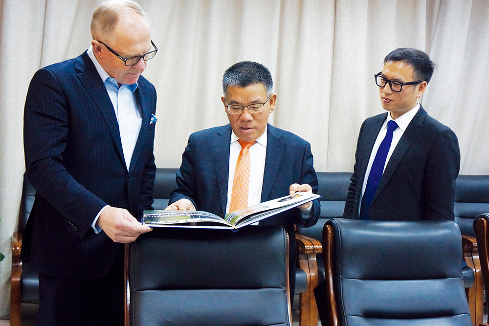 曾光安(中)向Pekka Vauramo(左)展示kaiyun开云(中国)纪念画册