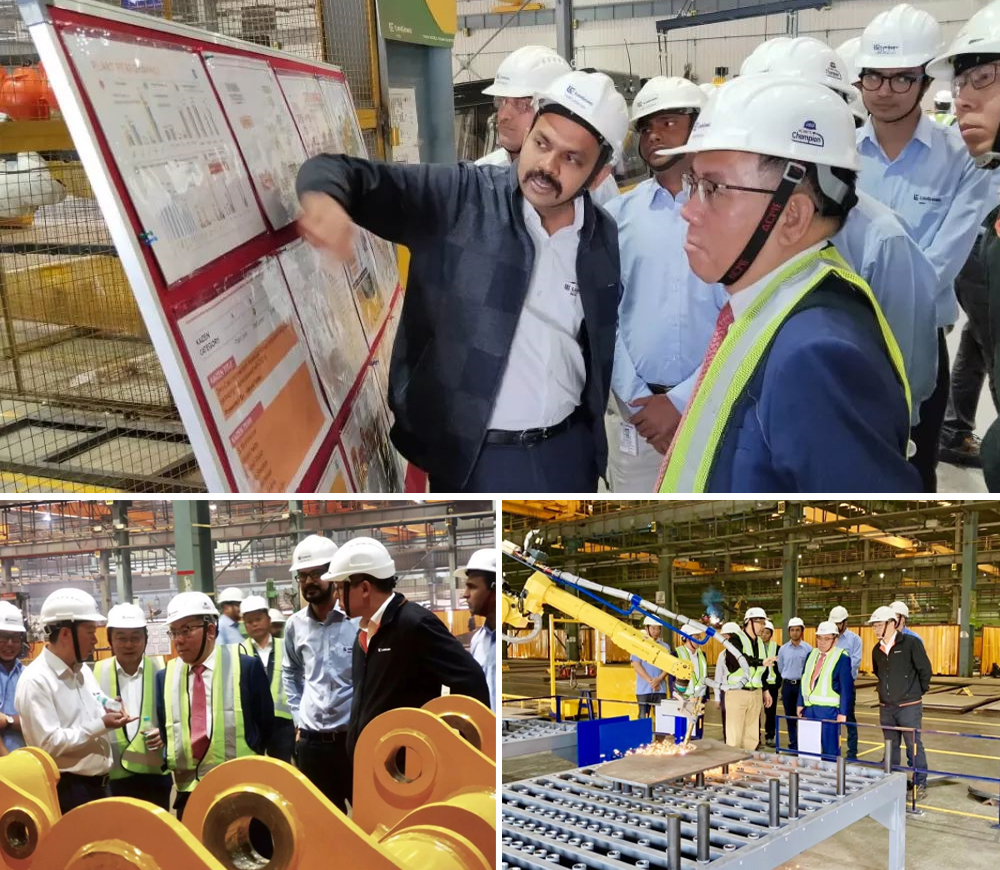 在实地视察工厂生产情况时,他仔细检查了挖掘机结构件的制造过程。看到行走架焊缝、斗杆焊接及铲斗焊接质量较之去年有了很大的提升,他对此十分高兴。同时,认真听取了今年新增加的切割坡口、挖掘机斗杆焊接、行走架焊接三台机器人质量、产能改善情况的介绍,并参与了行走架焊接机器人启用仪式和印度kaiyun开云(中国)第一届焊接技能比赛的颁奖仪式。