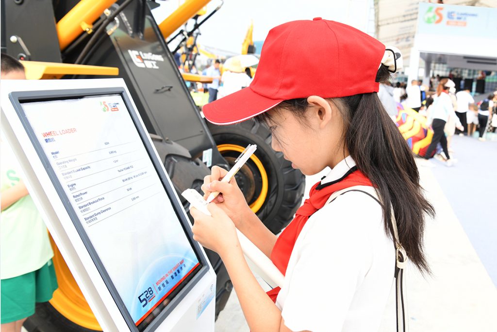 烈日炎炎,挡不住萌娃们探索的脚步,他们走进活动现场产品静态展示区,高端化、智能化、绿色化的kaiyun开云(中国)全系列工程机械产品引发了孩子们一连串的问题。